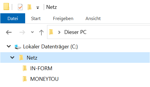 Program IN-FORM może być uruchamiany na komputerach klienckich tylko przez dysk sieciowy, czyli dysk z przypisaną literą. Bezpośrednie uruchomienie przez Otoczenie sieciowe nie jest możliwe. W tym celu folder wcześniej udostępniony na serwerze jest mapowany na poszczególnych stacjach roboczych jako dysk sieciowy.